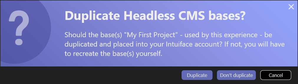 All of the bases used by the shared experience will be listed in this pop-up. By clicking the "Duplicate" button, you will create a copy of each base that will be stored in your Intuiface account. All connections between the original experience and the original bases will be recreated between the experience copy and the base copies.